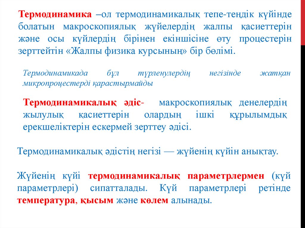 Термодинамика –ол термодинамикалық тепе-теңдік күйіндеболатын макроскопиялық жүйелердің жалпы қасиеттерін