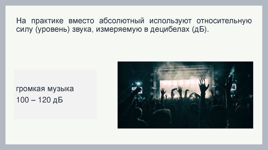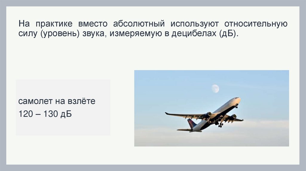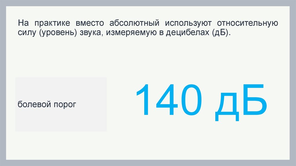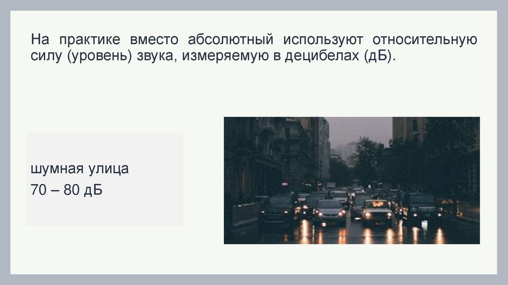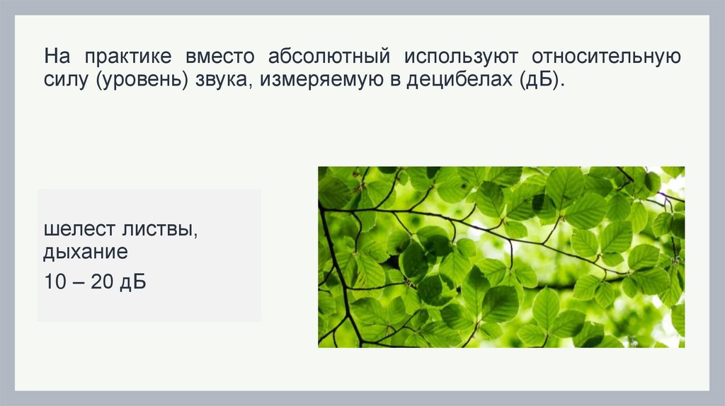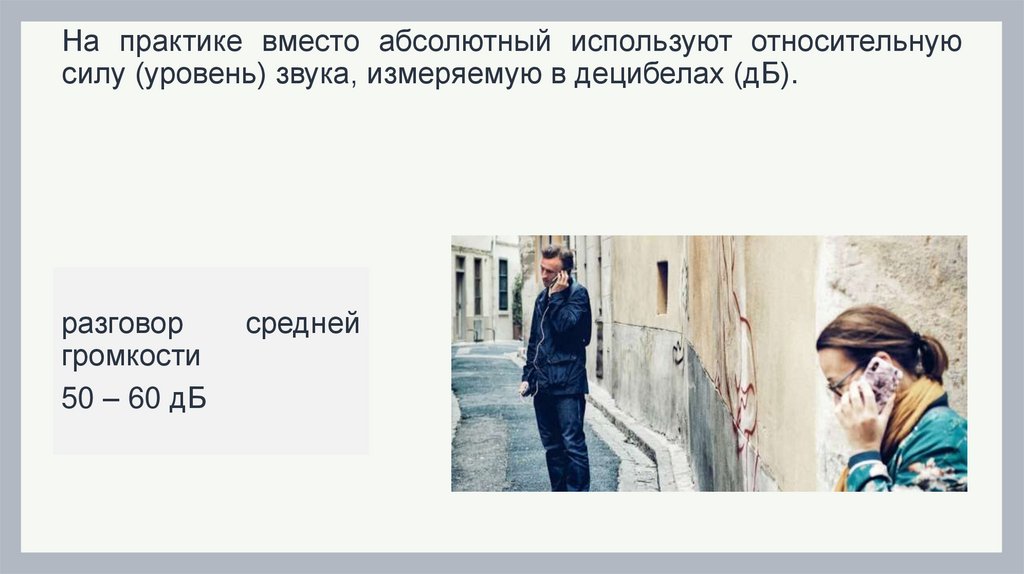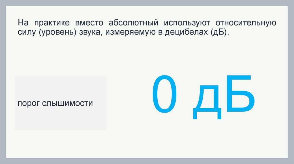 На практике вместо абсолютный используют относительнуюсилу (уровень) звука, измеряемую в децибелах (дБ).