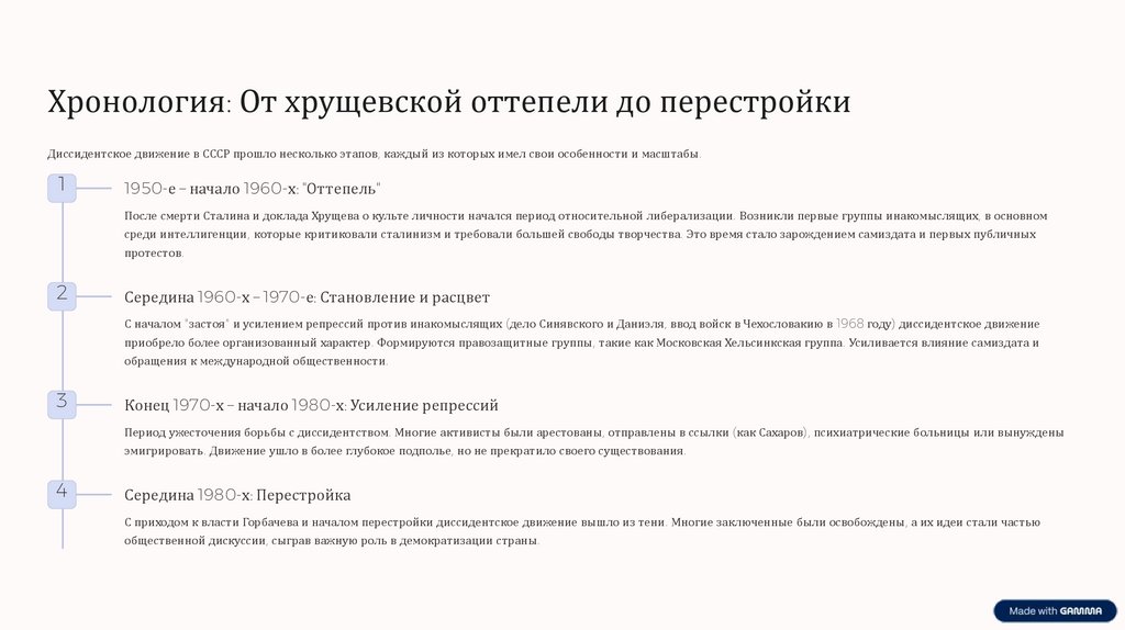 Хронология: От хрущевской оттепели до перестройкиДиссидентское движение в СССР прошло несколько этапов, каждый из которых имел свои особенности и масштабы.