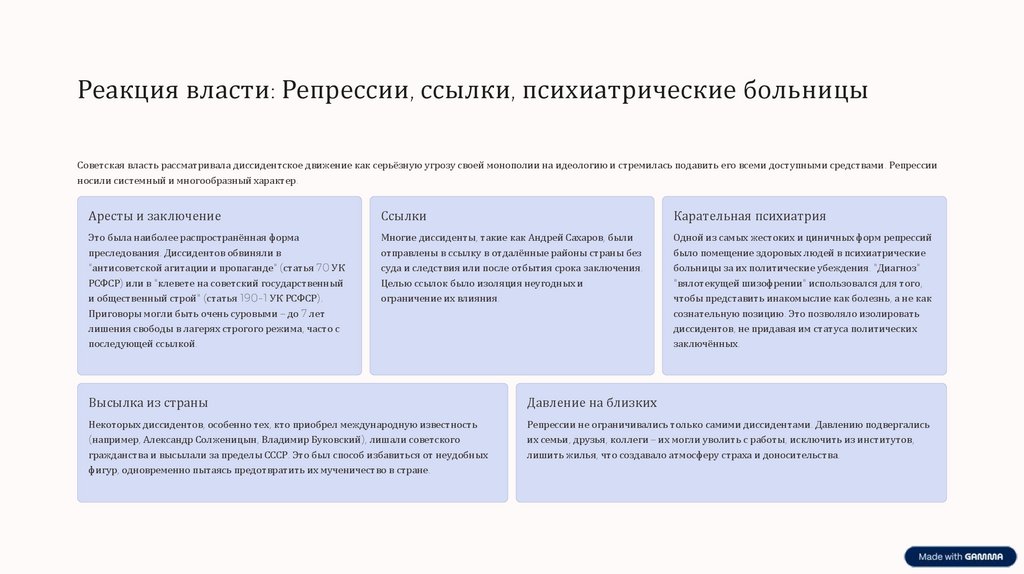 Реакция власти: Репрессии, ссылки, психиатрические больницыСоветская власть рассматривала диссидентское движение как серьёзную угрозу своей монополии на идеологию и стремилась подавить его всеми доступными средствами. Репрессии