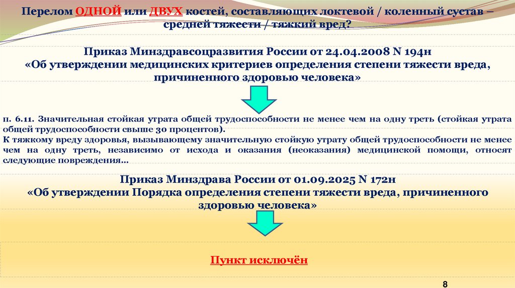 Перелом ОДНОЙ или ДВУХ костей, составляющих локтевой / коленный сустав –средней тяжести / тяжкий вред?