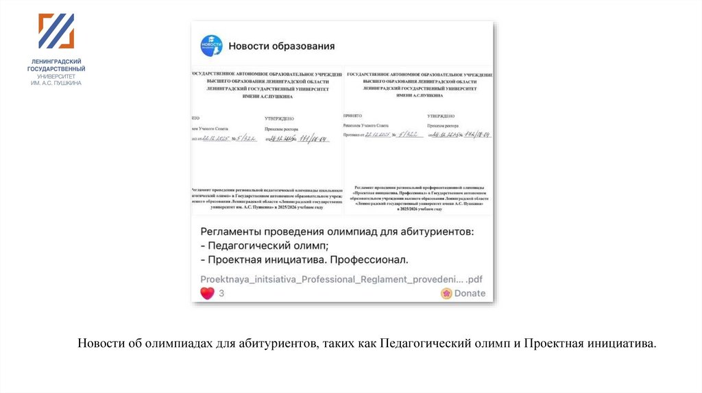 Новости об олимпиадах для абитуриентов, таких как Педагогический олимп и Проектная инициатива.3.