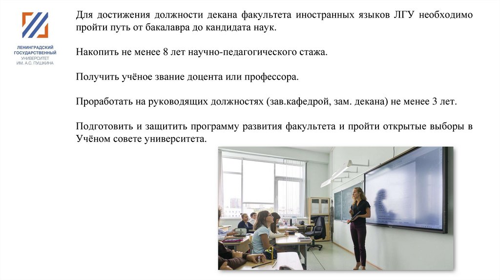 Для достижения должности декана факультета иностранных языков ЛГУ необходимопройти путь от бакалавра до кандидата наук.
