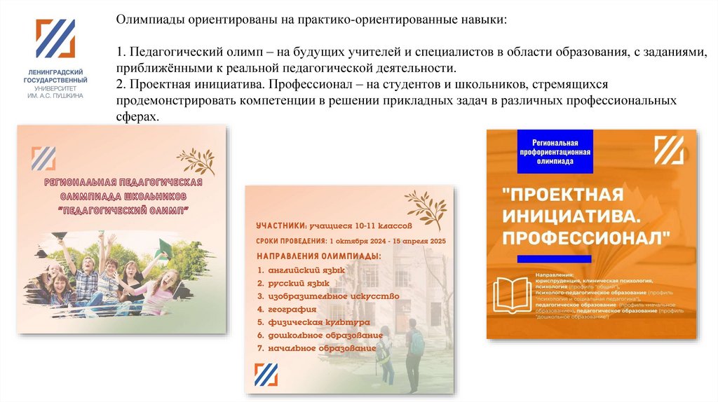 Олимпиады ориентированы на практико-ориентированные навыки:1. Педагогический олимп – на будущих учителей и специалистов в области образования, с заданиями,