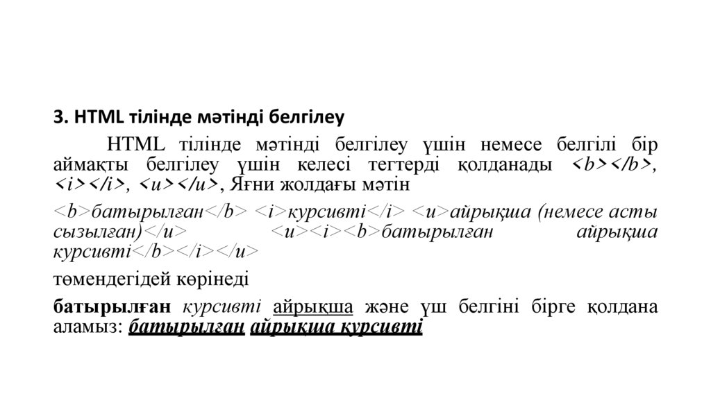 3. HTML тілінде мəтінді белгілеуHTML тілінде мəтінді белгілеу үшін немесе белгілі бір