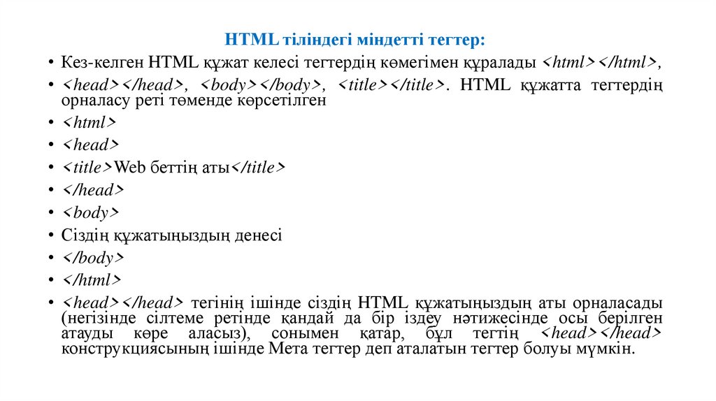 HTML тіліндегі міндетті тегтер:• Кез-келген HTML құжат келесі тегтердің көмегімен құралады <html></html>,