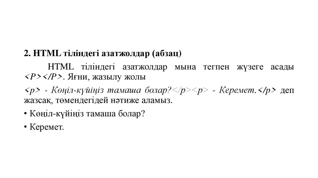 2. HTML тіліндегі азатжолдар (абзац)HTML тіліндегі азатжолдар мына тегпен жүзеге асады