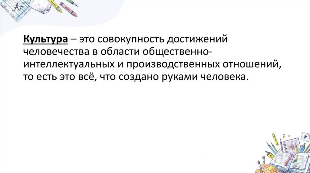 Культура – это совокупность достиженийчеловечества в области общественноинтеллектуальных и производственных отношений,
