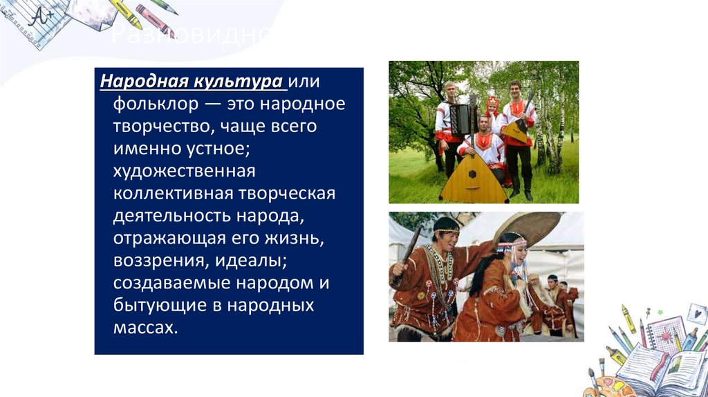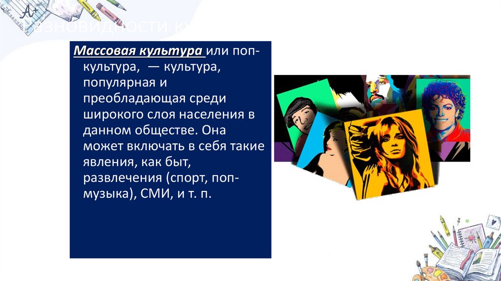 Разновидности культур.Массовая культура или попкультура, — культура,