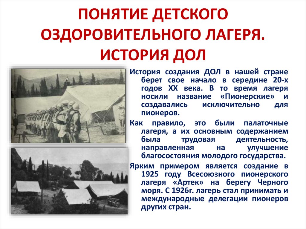 1. ПОНЯТИЕ ДЕТСКОГО ОЗДОРОВИТЕЛЬНОГО ЛАГЕРЯ. ИСТОРИЯ ДОЛ