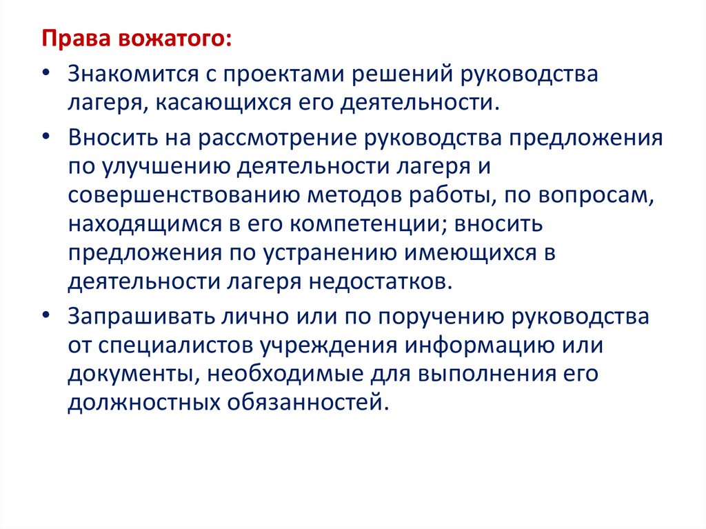 Права вожатого:• Знакомится с проектами решений руководства