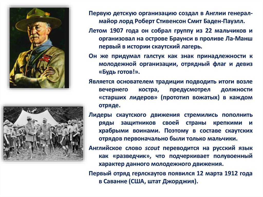 Первую детскую организацию создал в Англии генералмайор лорд Роберт Стивенсон Смит Баден-Пауэлл.Летом 1907 года он собрал группу из 22 мальчиков и
