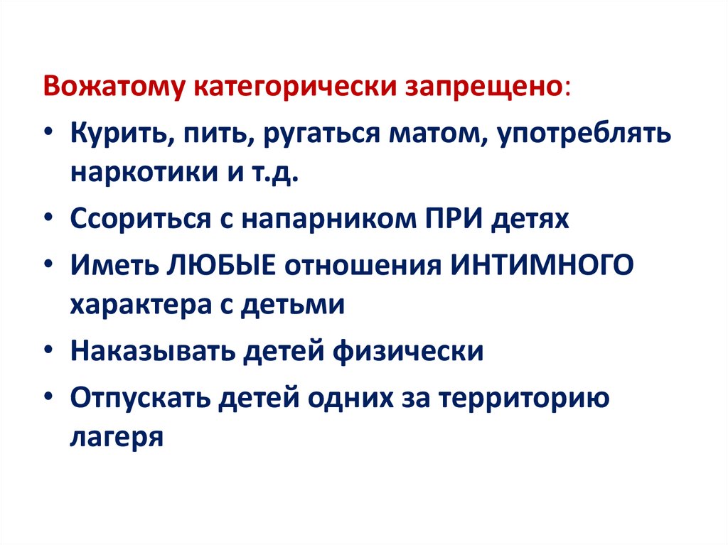 Вожатому категорически запрещено:• Курить, пить, ругаться матом, употреблять