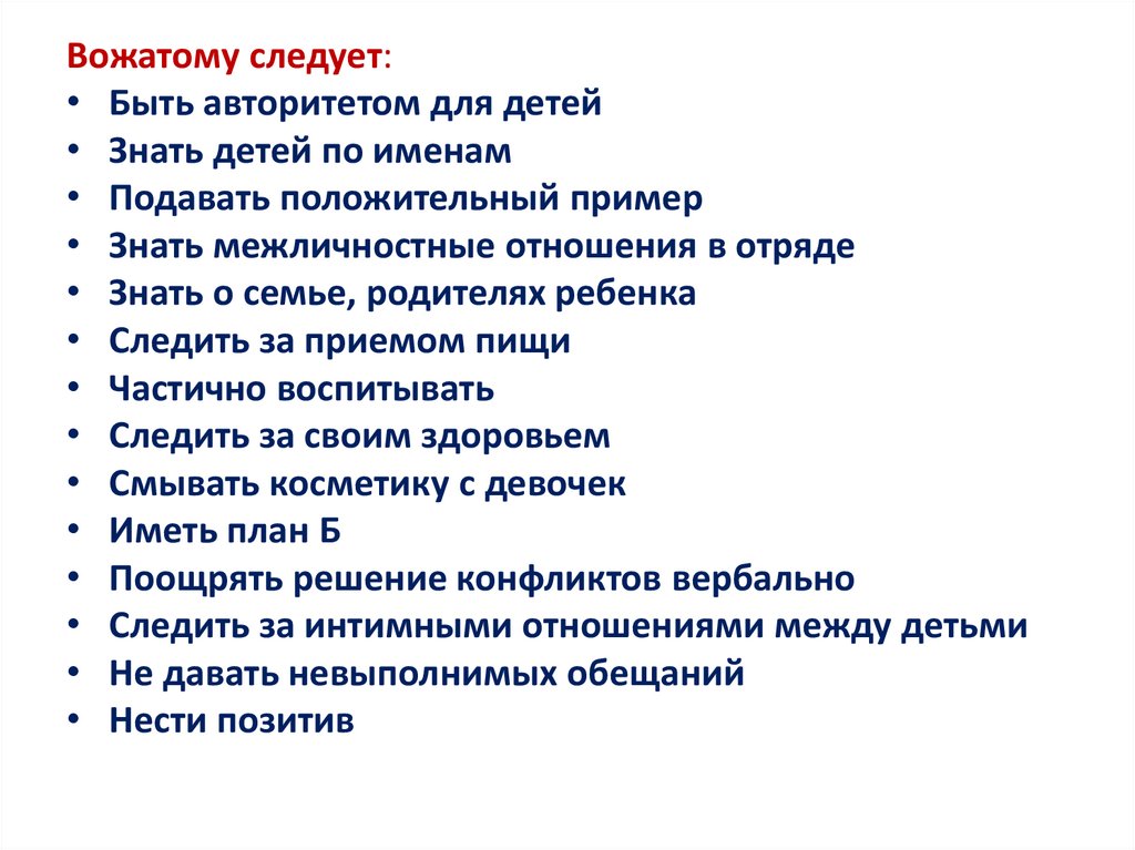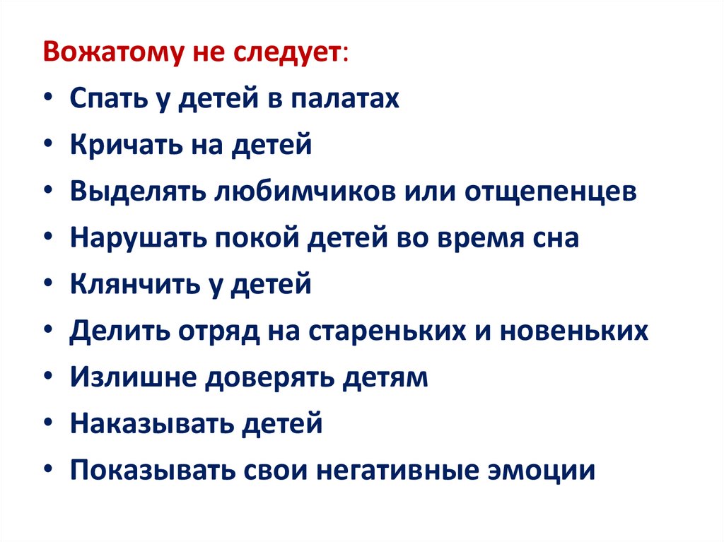 Вожатому не следует:• Спать у детей в палатах