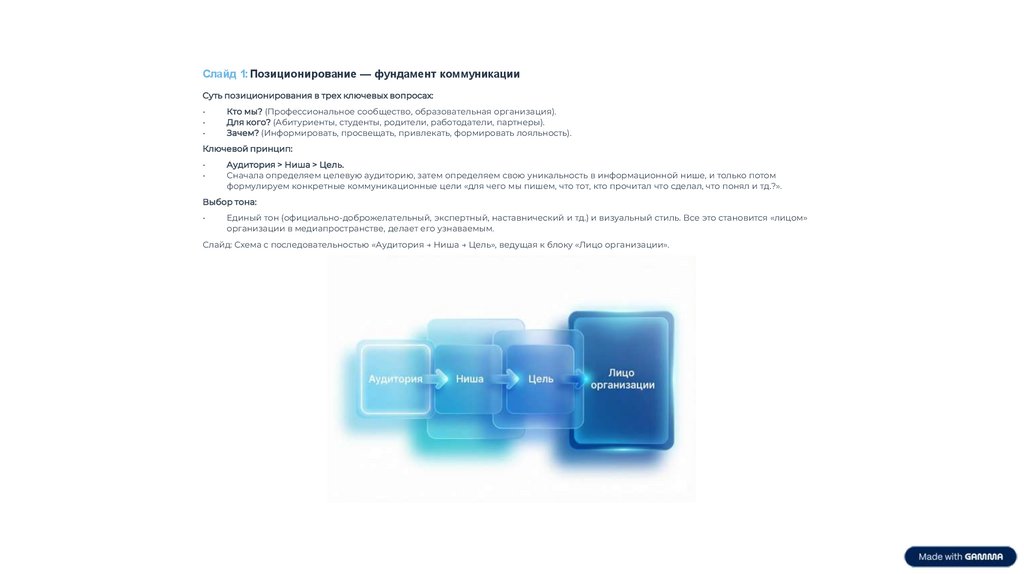 Слайд: Схема с последовательностью «Аудитория → Ниша → Цель», ведущая к блоку «Лицо организации».