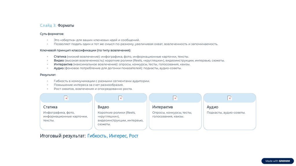 Статика (низкий вовлечение): инфографика, фото, информационные карточки, тексты.