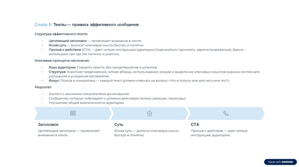 Структура: Короткие предложения, четкие абзацы, использование эмодзи и выделение ключевых смыслов жирным кеглем для