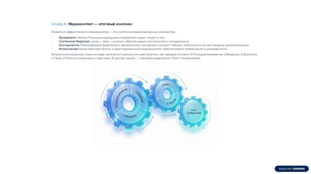 Слайд 6: Медиаконтент — итоговый комплексРазвитие эффективного медиацентра — это система взаимосвязанных элементов.