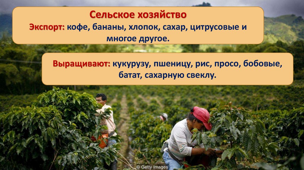 Сельское хозяйствоЭкспорт: кофе, бананы, хлопок, сахар, цитрусовые и