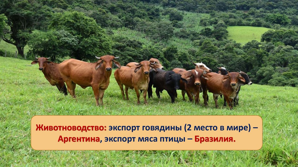 Животноводство: экспорт говядины (2 место в мире) –Аргентина, экспорт мяса птицы – Бразилия.