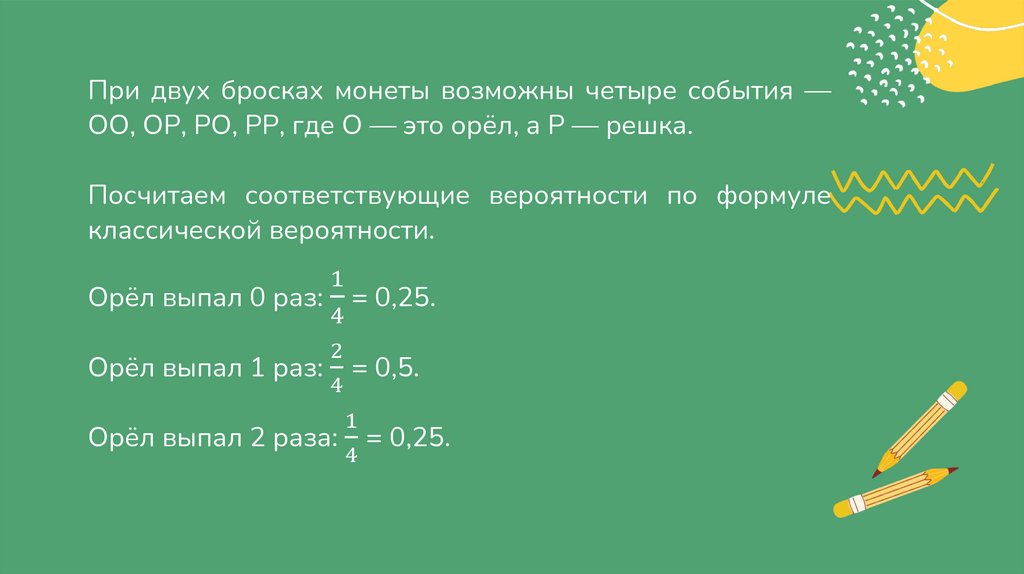 При двух бросках монеты возможны четыре события —ОО, ОР, РО, РР, где О — это орёл, а Р — решка.