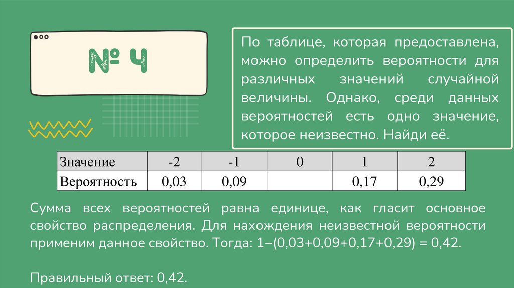 применим данное свойство. Тогда: 1−(0,03+0,09+0,17+0,29) = 0,42.