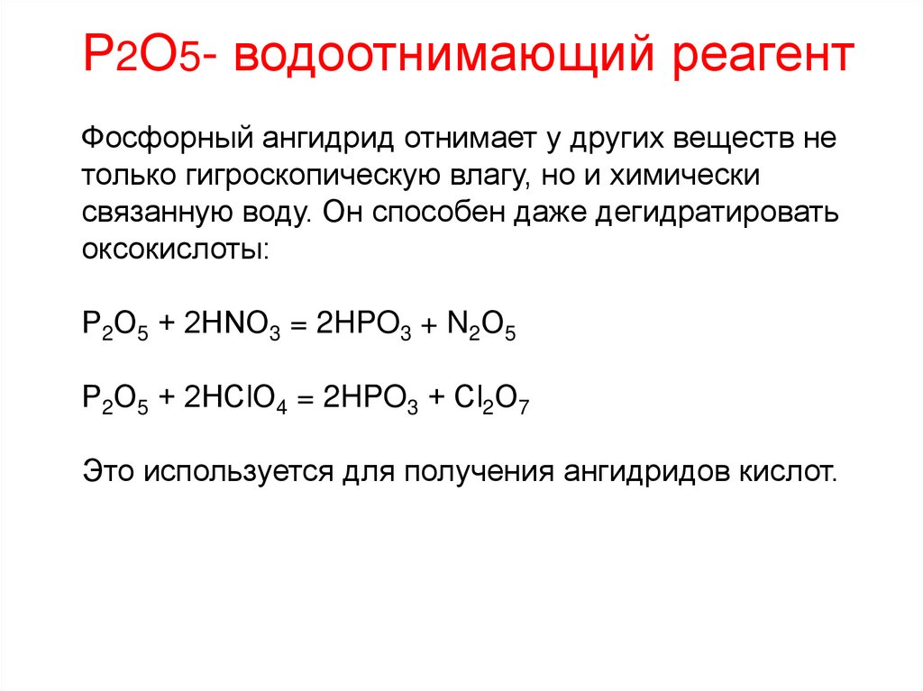 Р2О5- водоотнимающий реагентФосфорный ангидрид отнимает у других веществ не