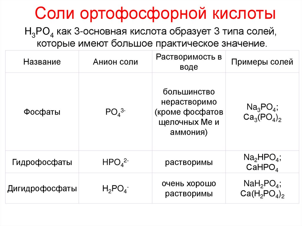 Соли ортофосфорной кислотыН3РO4 как 3-основная кислота образует 3 типа солей,