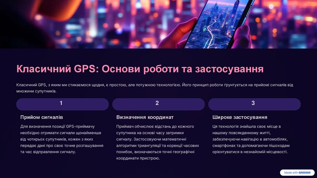 Класичний GPS: Основи роботи та застосуванняКласичний GPS, з яким ми стикаємося щодня, є простою, але потужною технологією. Його принцип роботи ґрунтується на прийомі сигналів від