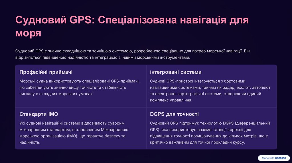Судновий GPS є значно складнішою та точнішою системою, розробленою спеціально для потреб морської навігації. Він