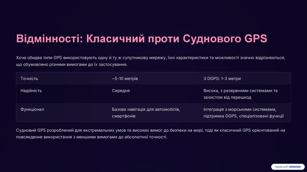 Відмінності: Класичний проти Суднового GPSХоча обидва типи GPS використовують одну й ту ж супутникову мережу, їхні характеристики та можливості значно відрізняються,