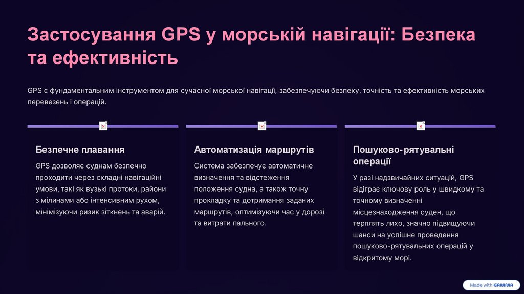 GPS є фундаментальним інструментом для сучасної морської навігації, забезпечуючи безпеку, точність та ефективність морських