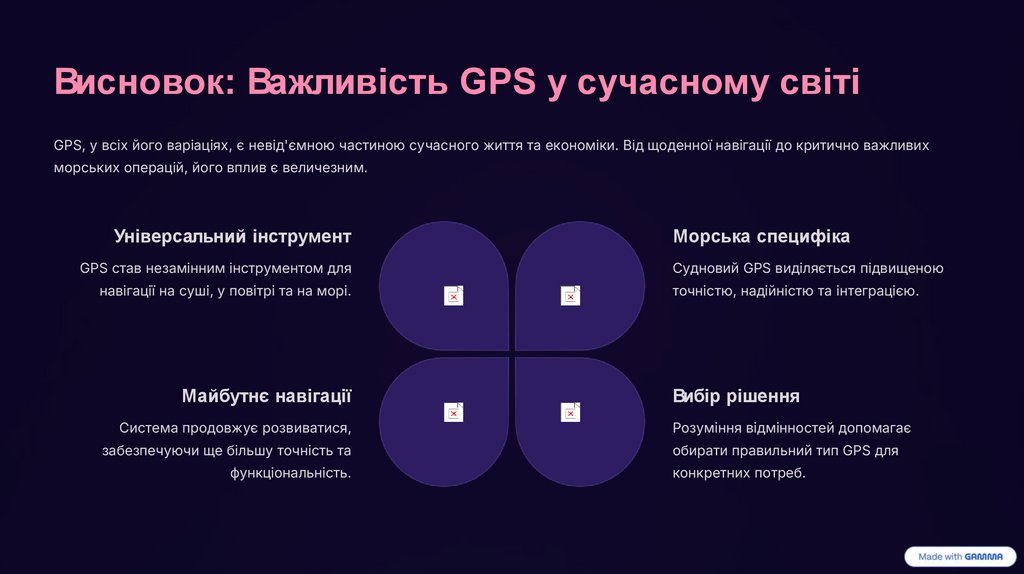 Висновок: Важливість GPS у сучасному світіGPS, у всіх його варіаціях, є невід'ємною частиною сучасного життя та економіки. Від щоденної навігації до критично важливих