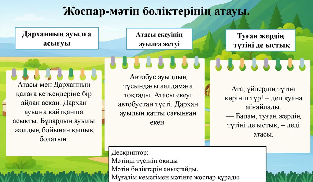 Жоспар-мәтін бөліктерінің атауы.Дарханның ауылға
