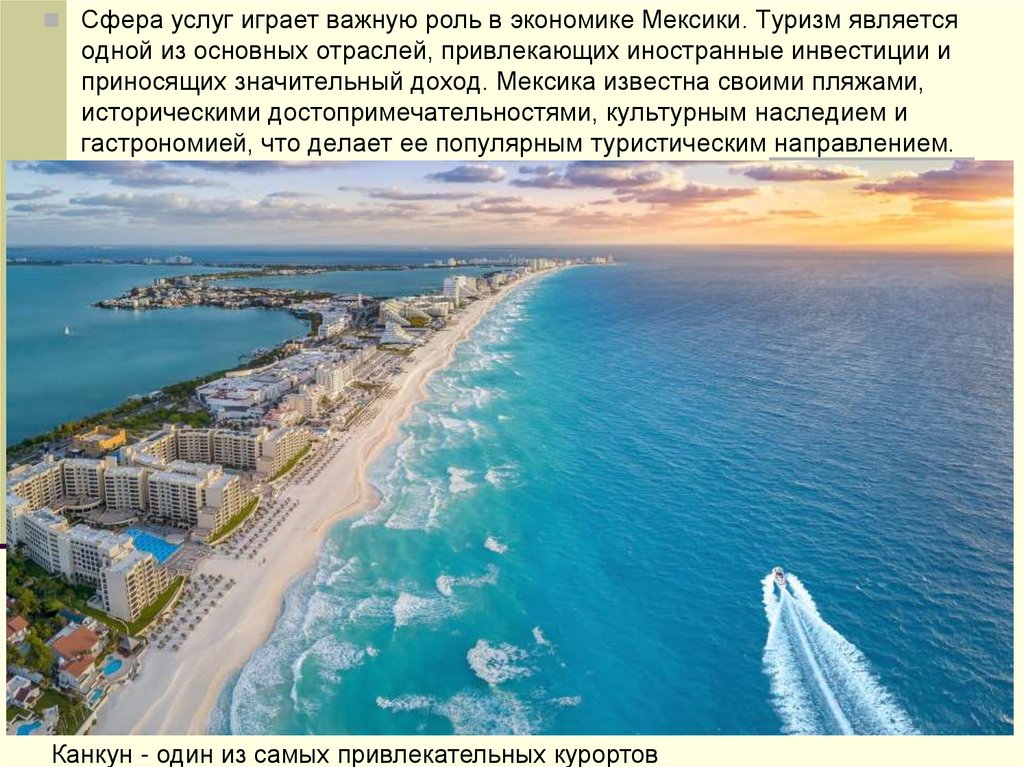 Сфера услуг играет важную роль в экономике Мексики. Туризм являетсяодной из основных отраслей, привлекающих иностранные инвестиции и