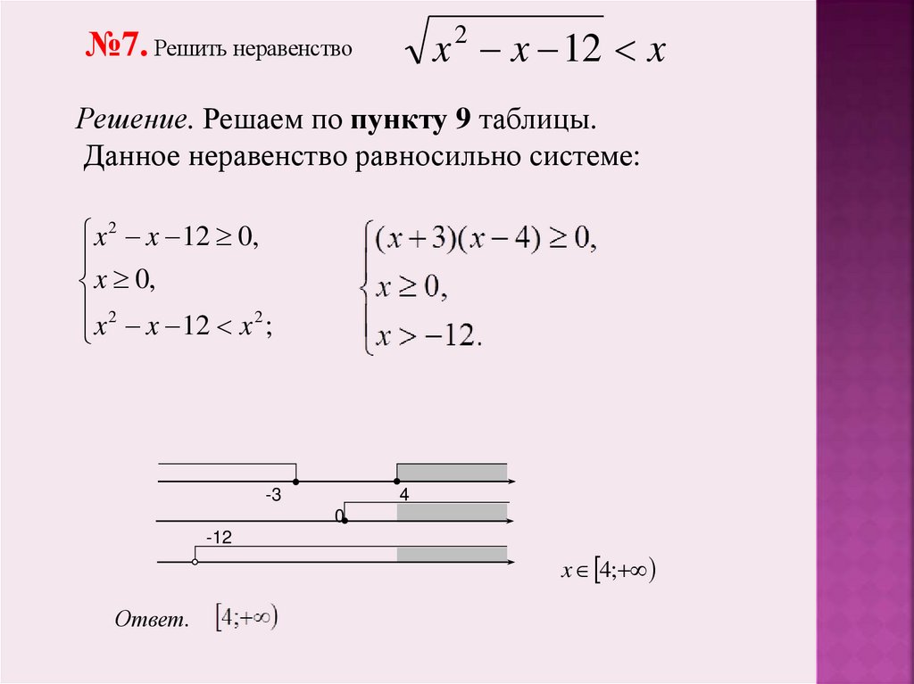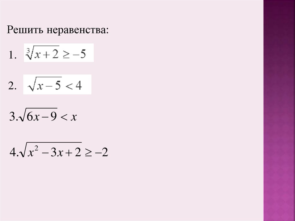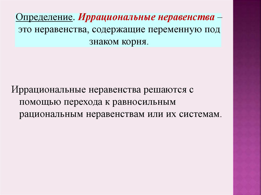 Определение. Иррациональные неравенства –это неравенства, содержащие переменную под