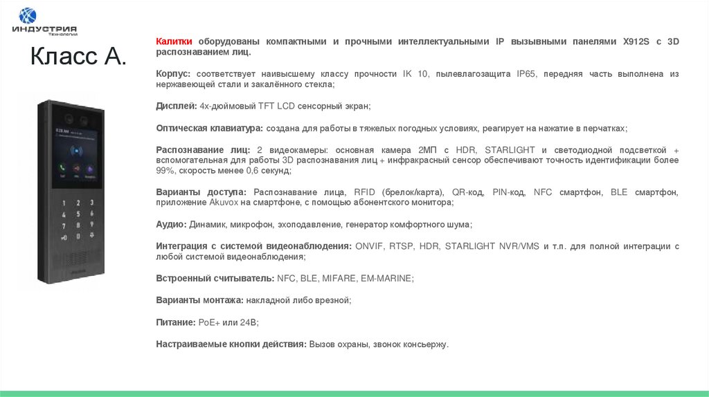 Класс А.Калитки оборудованы компактными и прочными интеллектуальными IP вызывными панелями Х912S с 3D