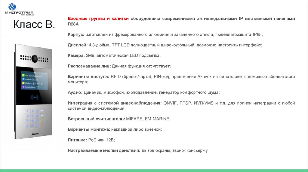 Класс B.Входные группы и калитки оборудованы современными антивандальными IP вызывными панелями