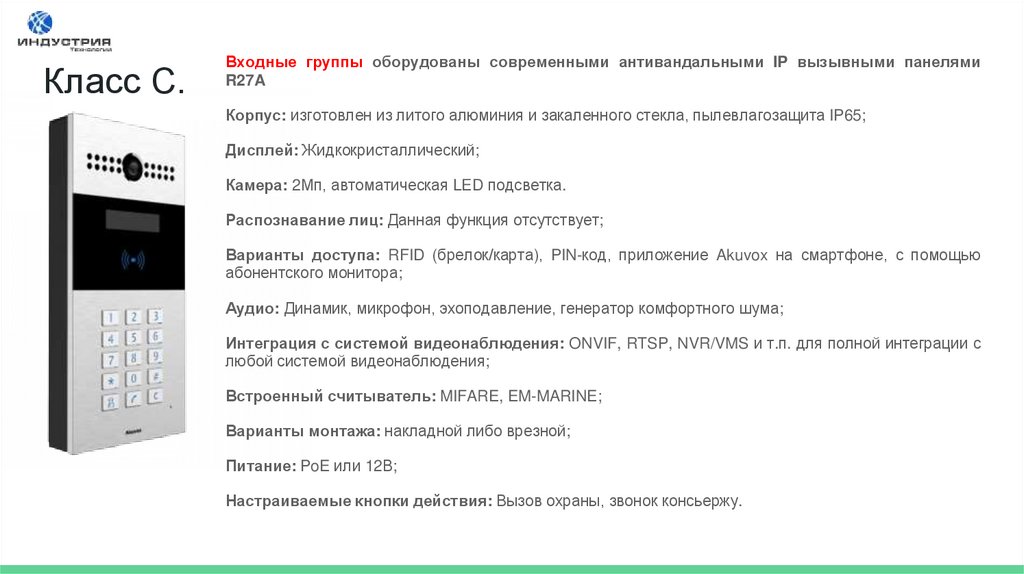 Класс С.Входные группы оборудованы современными антивандальными IP вызывными панелями