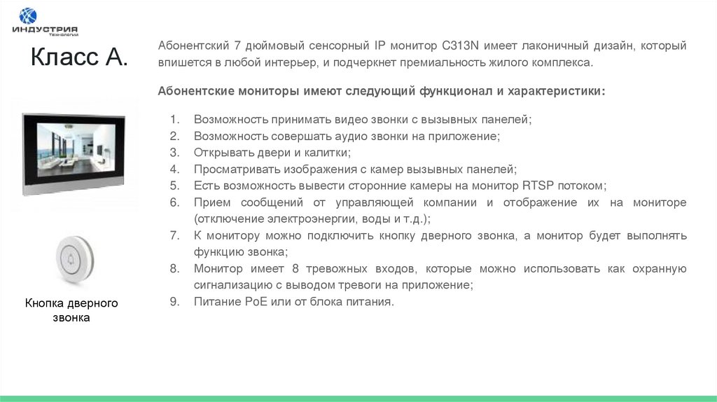 Класс А.Абонентский 7 дюймовый сенсорный IP монитор C313N имеет лаконичный дизайн, который