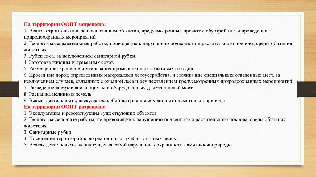 На территории ООПТ запрещено:1. Всякое строительство, за исключением объектов, предусмотренных проектом обустройства и проведения