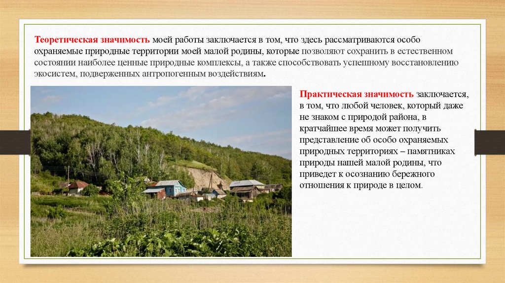Теоретическая значимость моей работы заключается в том, что здесь рассматриваются особоохраняемые природные территории моей малой родины, которые позволяют сохранить в естественном