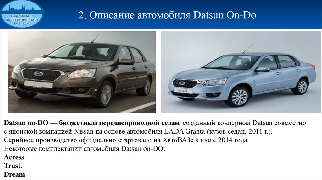 2. Описание автомобиля Datsun On-DoDatsun on-DO — бюджетный переднеприводной седан, созданный концерном Datsun совместно