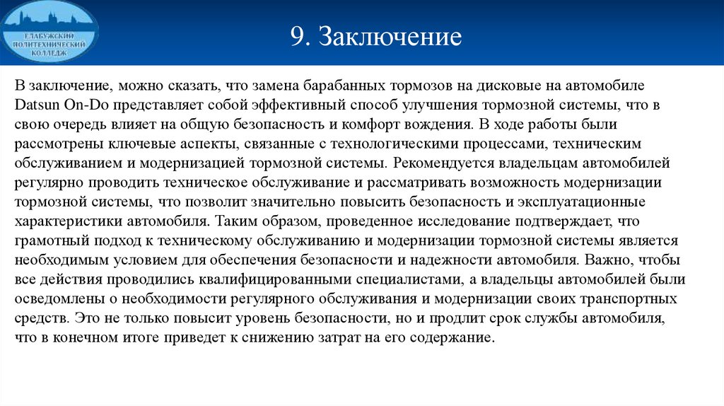9. ЗаключениеВ заключение, можно сказать, что замена барабанных тормозов на дисковые на автомобиле