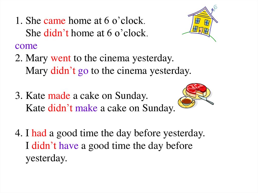 1. She came home at 6 o’clock.She didn’t home at 6 o’clock.