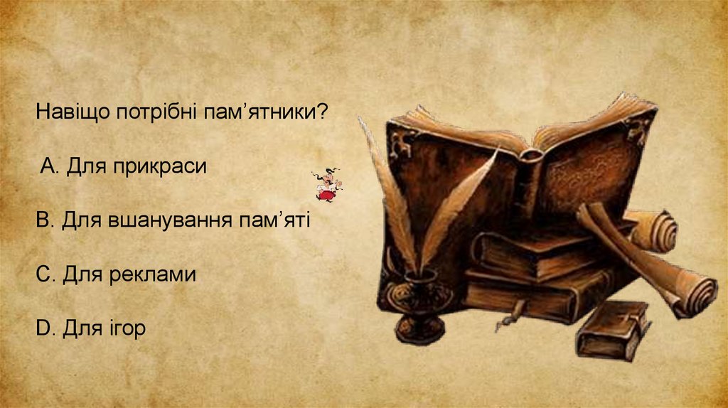 Навіщо потрібні пам’ятники?A. Для прикраси