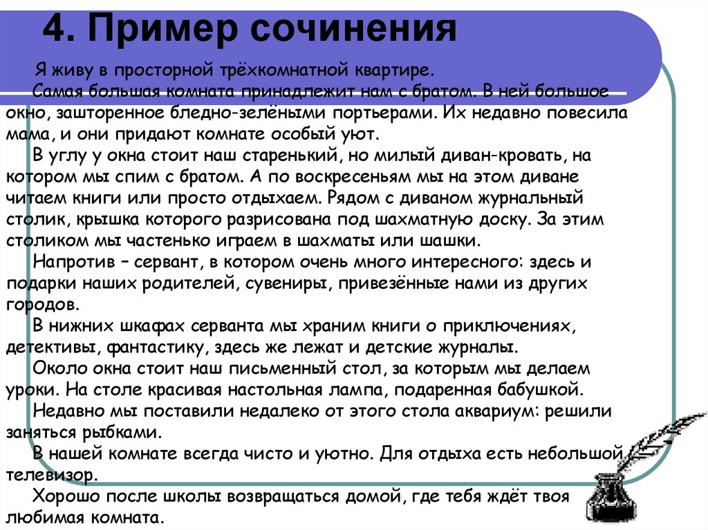 4. Пример сочиненияЯ живу в просторной трёхкомнатной квартире.