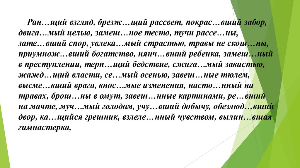 Ран…щий взгляд, брезж…щий рассвет, покрас…вший забор,двига…мый целью, замеш…ное тесто, тучи рассе…ны,