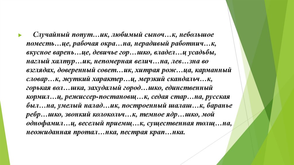 Случайный попут…ик, любимый сыноч…к, небольшоепоместь…це, рабочая окра…на, нерадивый работнич…к,