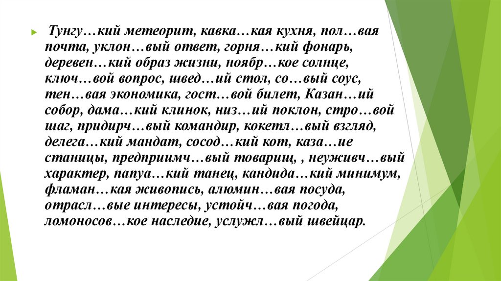 Тунгу…кий метеорит, кавка…кая кухня, пол…ваяпочта, уклон…вый ответ, горня…кий фонарь,